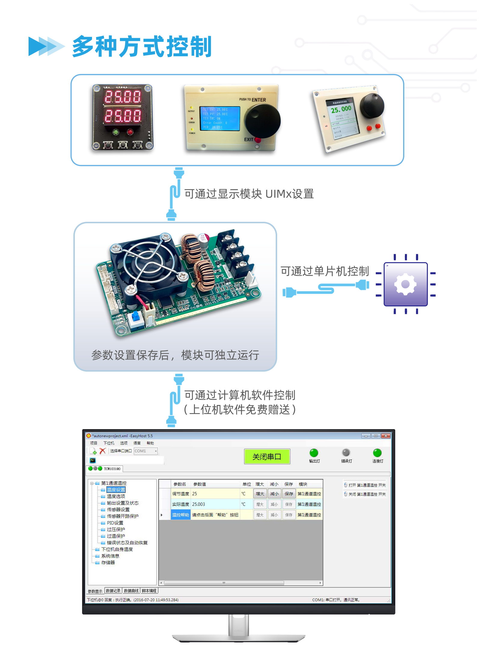 提供完整串口控制命令,用户可自己编程通过计算机或单片机控制温控模块;