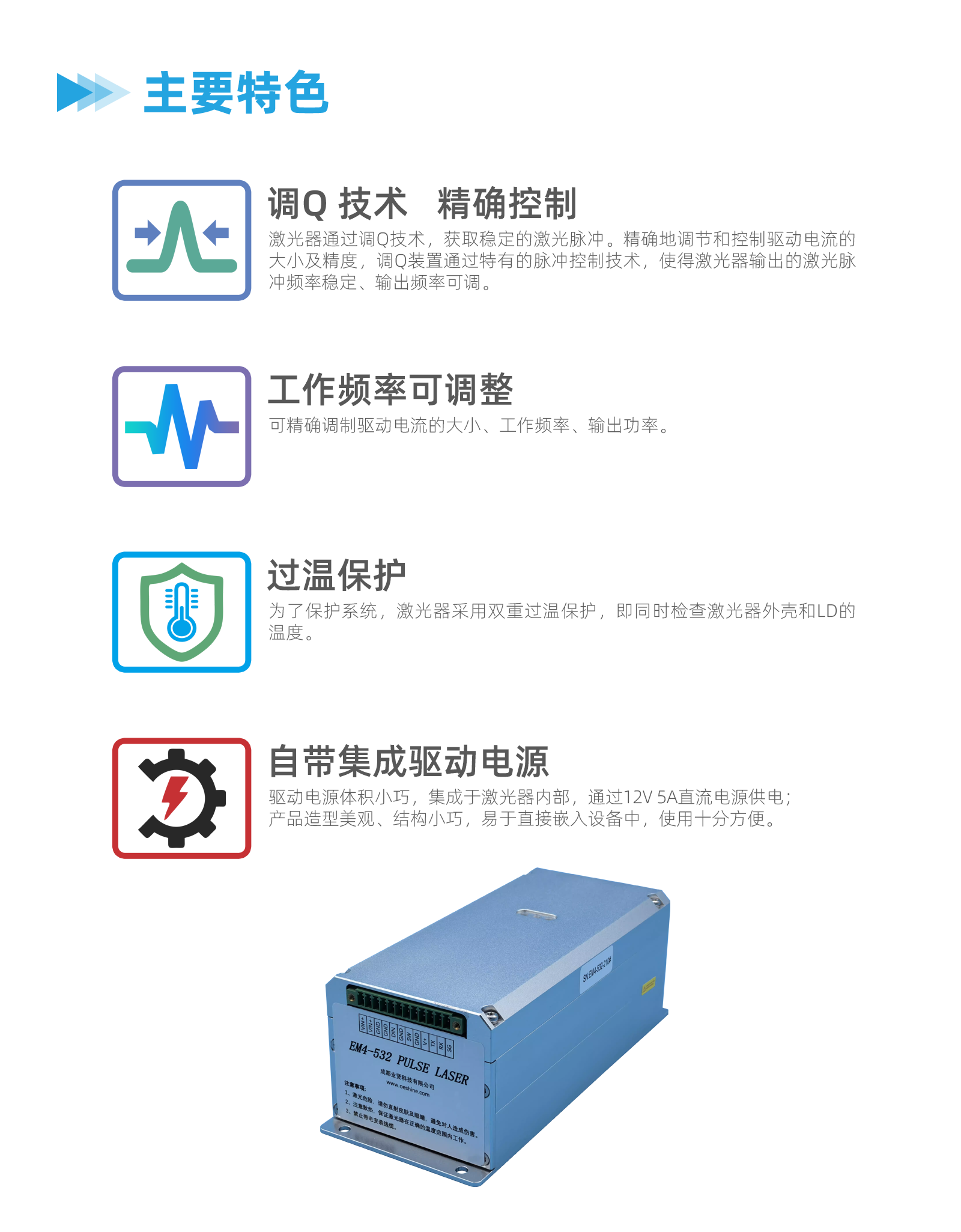 激光器通过调Q 技术获取稳定的激光脉冲,有1064nm 及532nm 两种波长可供选择。