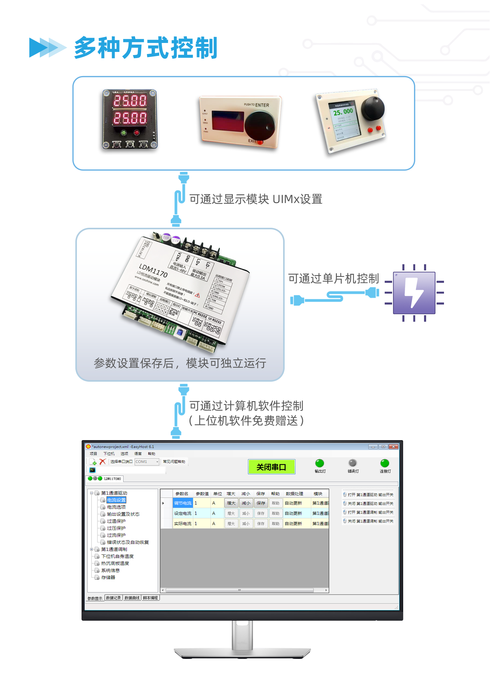 - 支持1个串口控制多个模块,支持和TCM系列温控模块配合使用。