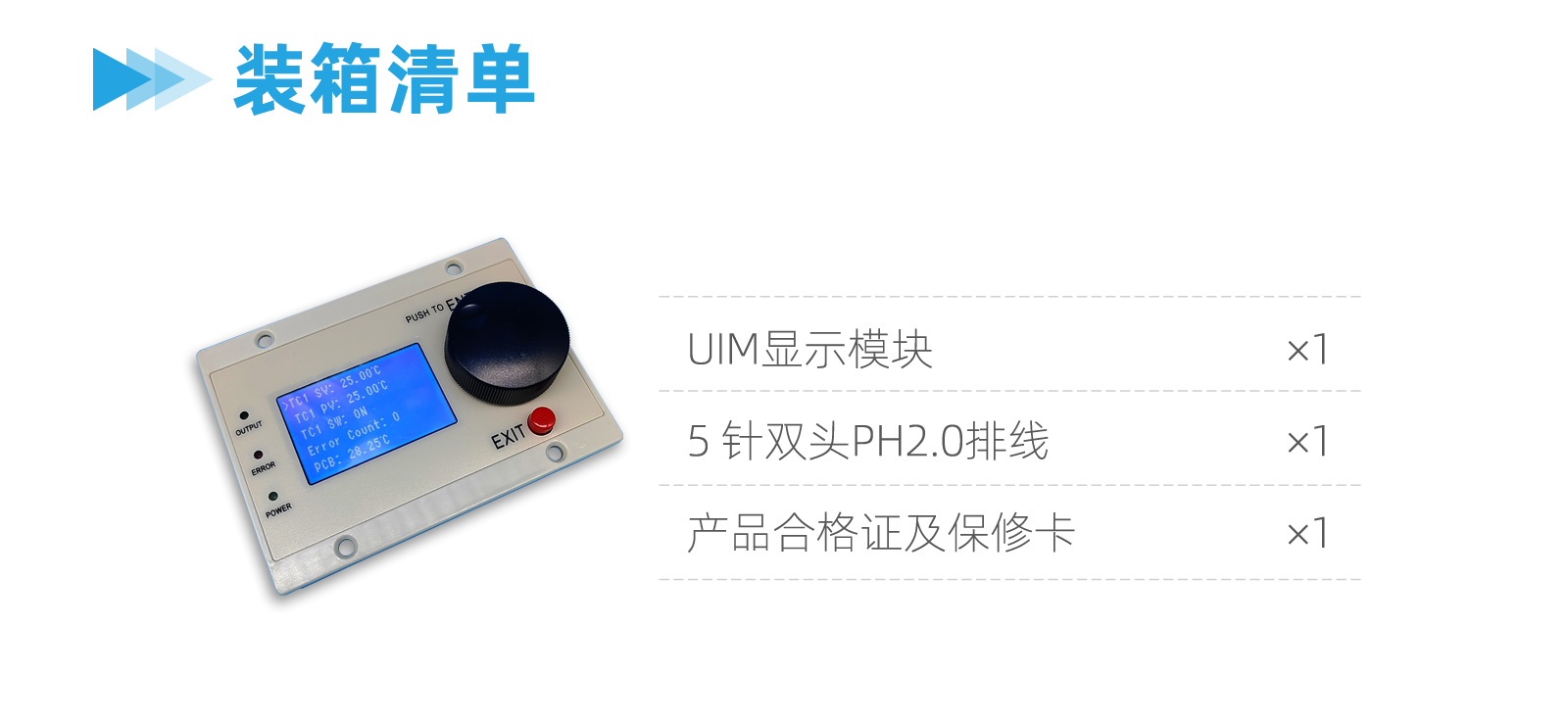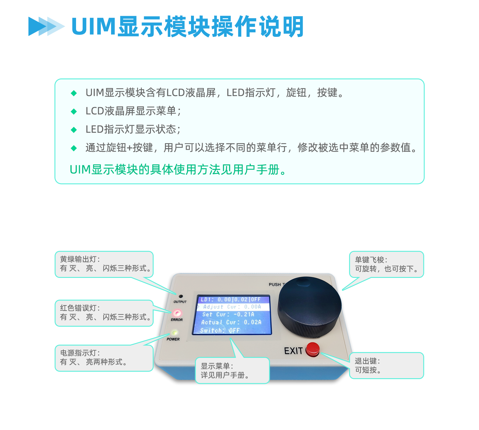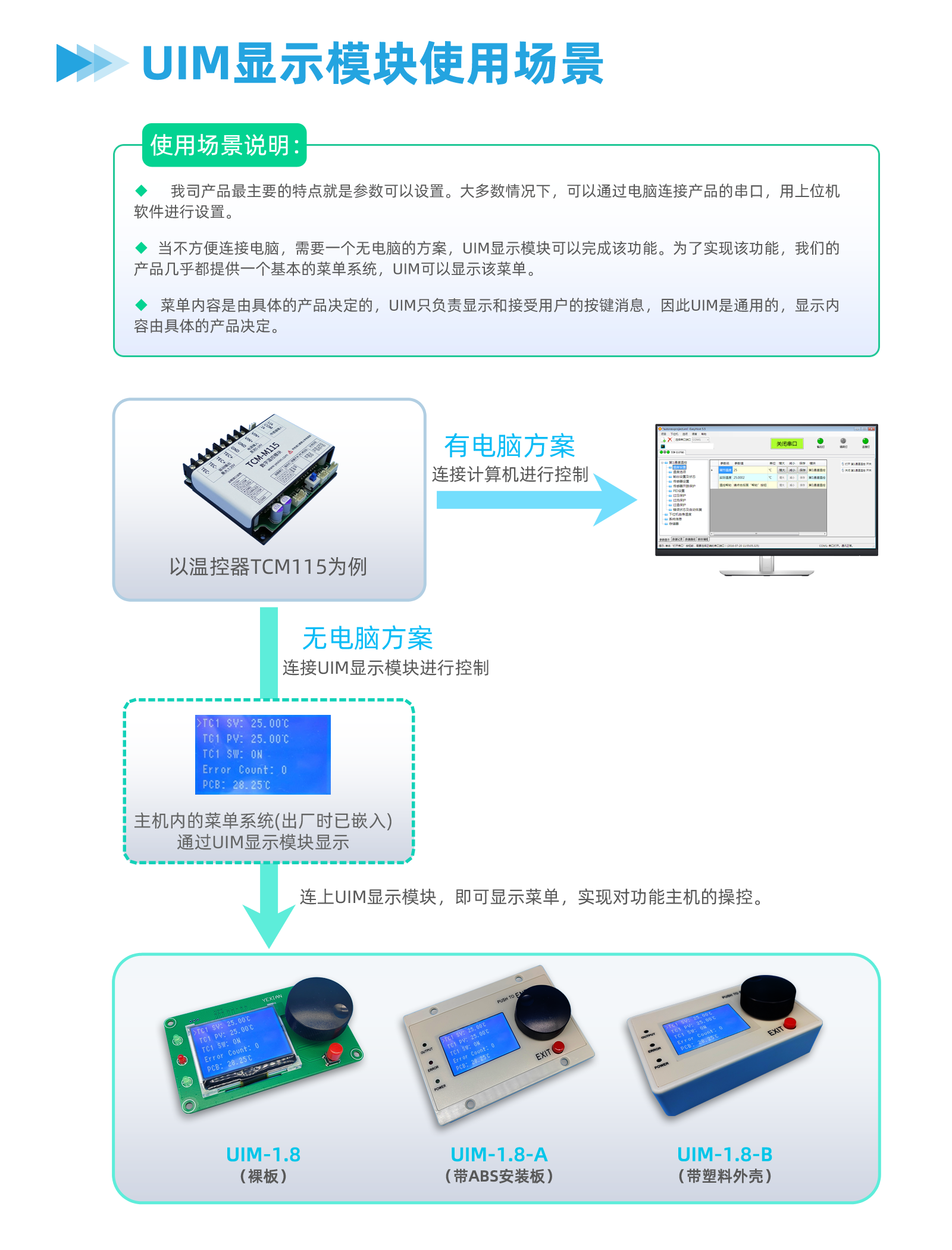 有时,不方便连接电脑,因此需要1个无电脑的方案。显示模块UIM可以完成该功能。为了实现该功能,我们的产品几乎都提供1个基本的菜单系统,UIM可以显示该菜单。
